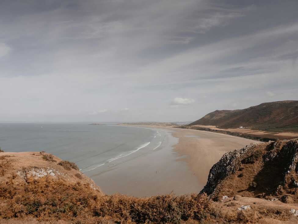 Rhossili feels like a viewpoint stretched into a village. You drive out across the high spine of Gower and then the land falls away into a jaw dropping sweep of sand, sea and sky. Rhossili Bay lies below in a perfect curve, with Worms Head reaching defiantly out into the water. From the clifftop, everything is wind, space and that long white edge of surf.